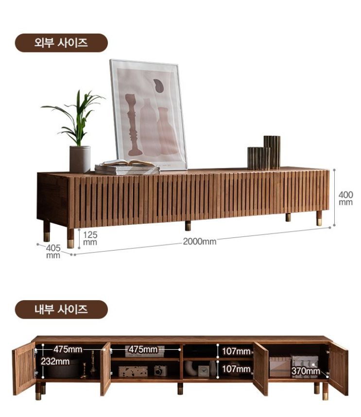 이 제품의 가장 큰 특징은 ‘높은 구조의 원목 TV 거실장’이라는 점입니다.