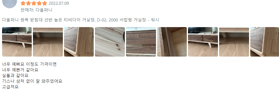"원목 질감과 디자인에 대한 만족도가 높고, 가격 대비 실물이 더 예쁘다"