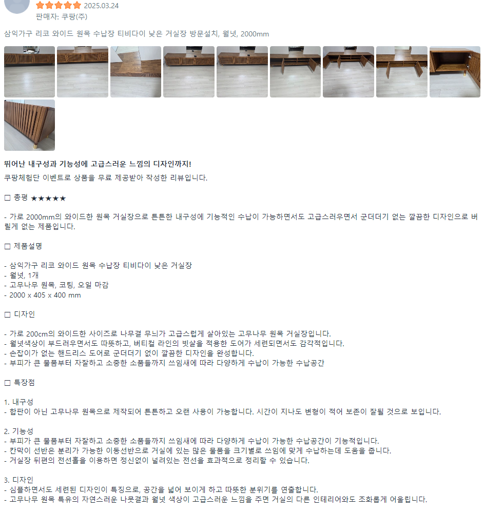 실제 사용자들의 구매 후기로는 가격 대비 마감과 안정감에 대한 만족도가 높은 편이라, 첫 원목 거실장으로 선택하기에도 부담이 적은 제품이라는 인상이 강합니다.